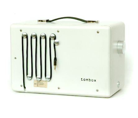 The tombox pays homage to loudspeakers from the heyday of industrial design.Today those first rate loudspeakers with their unique designs often stand idle in attics. We collect those seemingly useless passive loudspeakers and convert them into a battery powered portable music system (battery life: up to 30 hrs). Everything connects to the tombox with a 3.5 mm stereo jack! Each tombox is a unique piece with a serial number and its own sound characteristics.